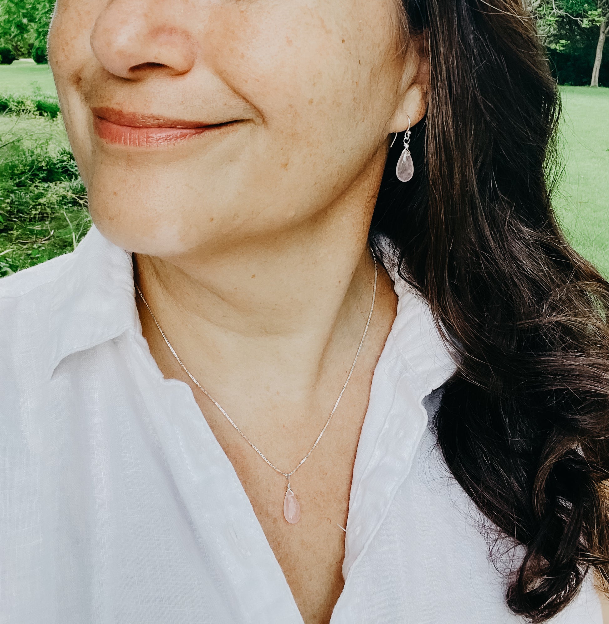Genuine Rose Quartz: Hand-cut teardrop gemstones, known as the stone of unconditional love and healing.