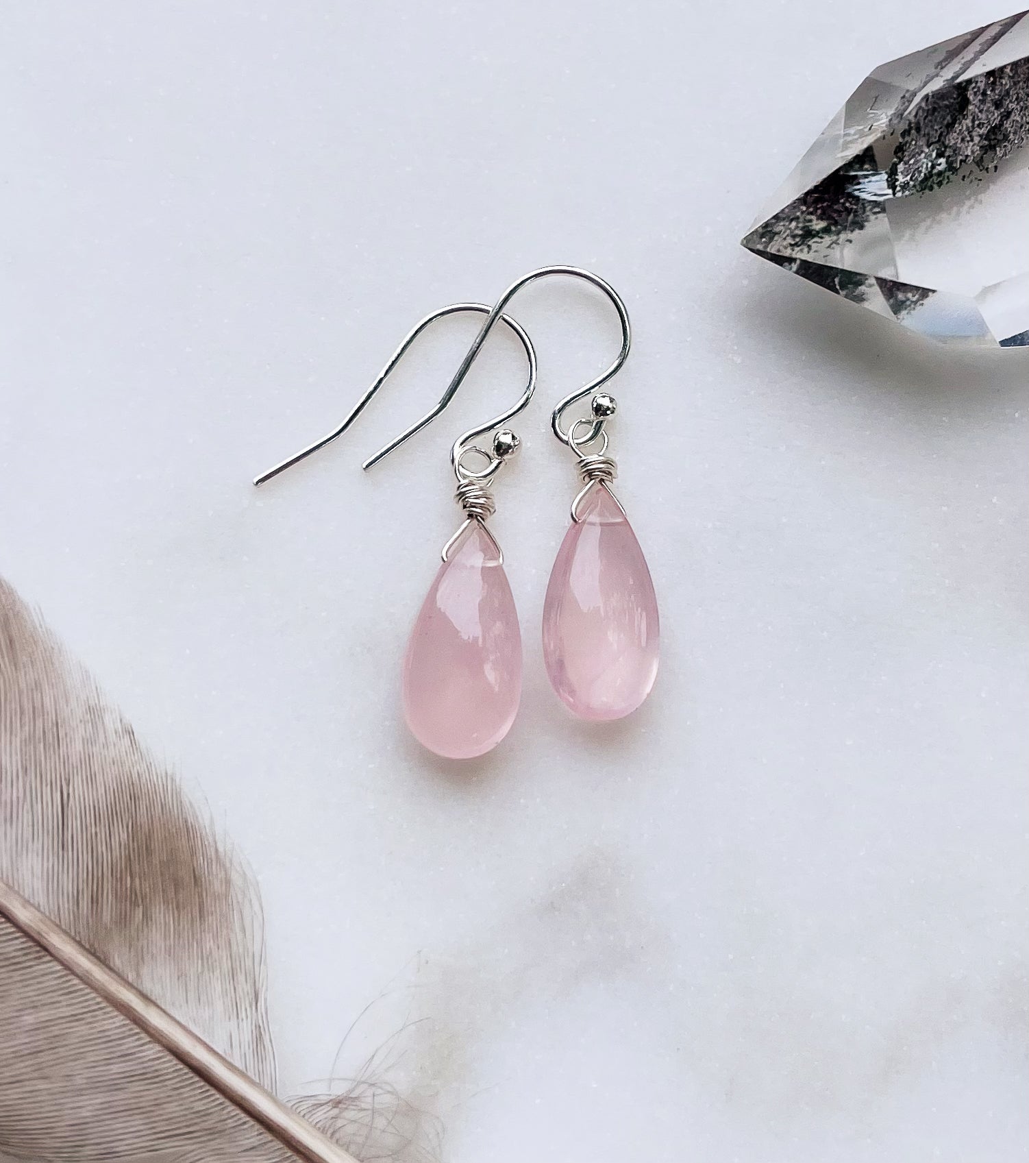 Minimalist Rose Quartz Teardrop Earrings in Sterling Silver