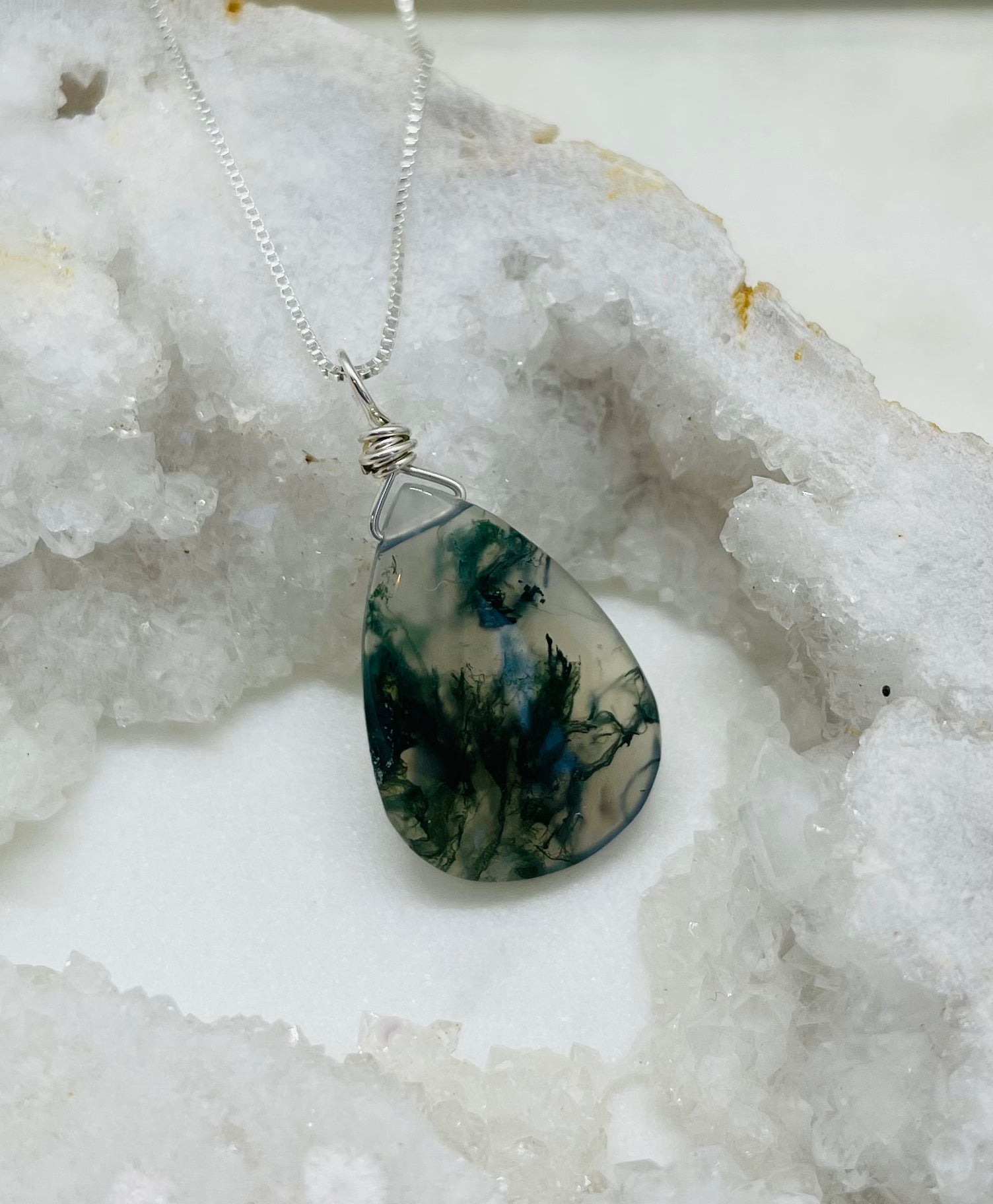 Moss Agate Teardrop Shaped Pendant Necklace - A Whisper of Nature's Beauty